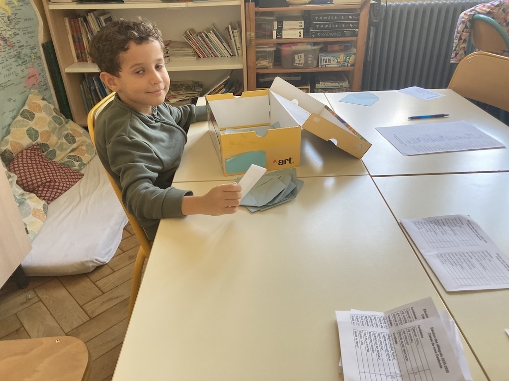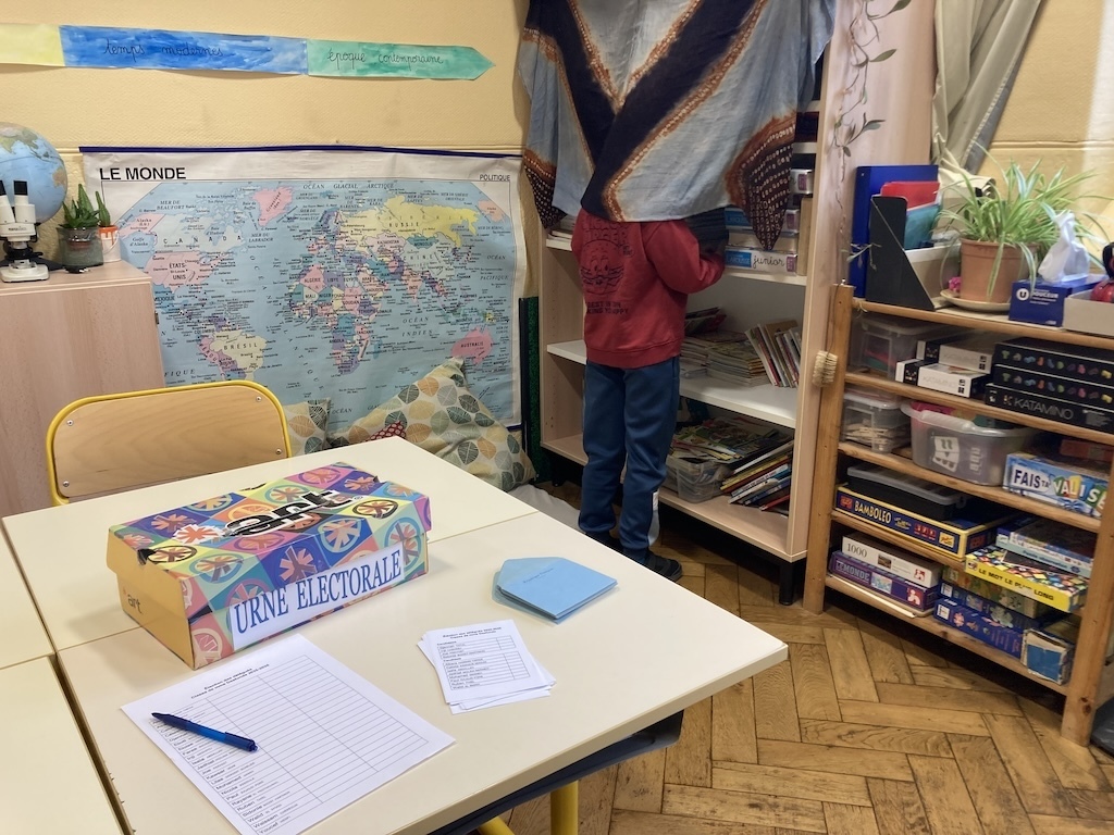 En arrivant, la maitresse a rappelé la façon de faire : prendre un bulletin et une enveloppe, aller à l’isoloir pour choisir au moins un garçon et une fille, mettre l’enveloppe dans l’urne et penser à signer la feuille d’émargement pour qu’on sache où nous en étions du vote. On pouvait voter n’importe quand dans la journée, mais on devait l’avoir fait avant la récréation de l’après-midi.