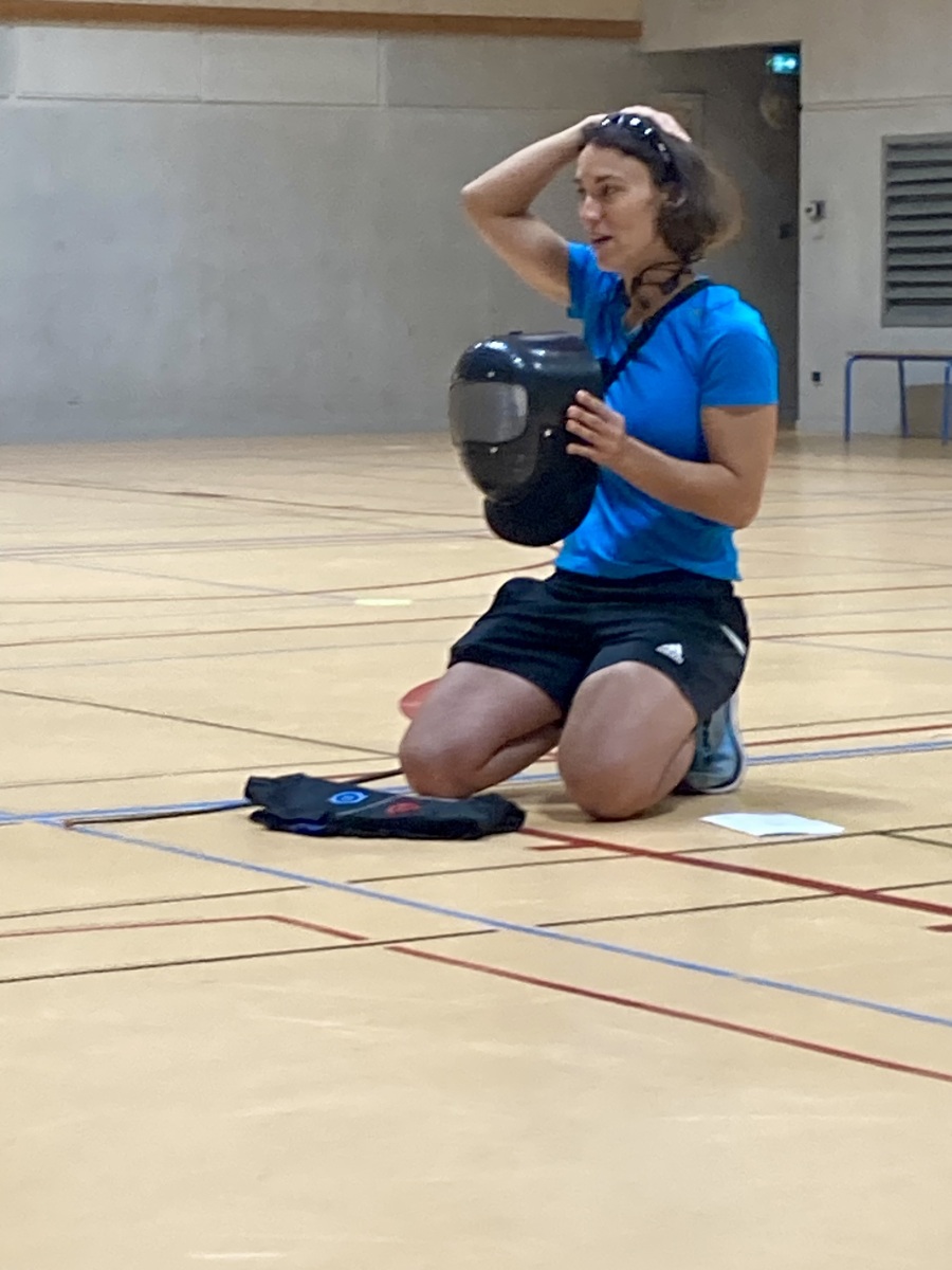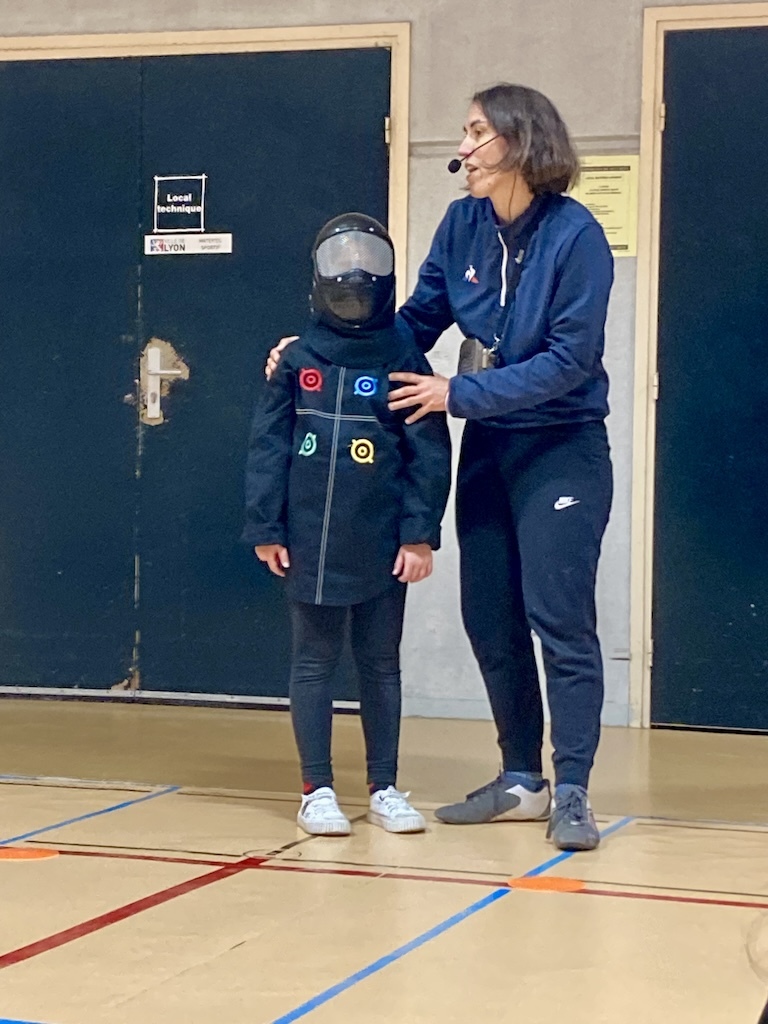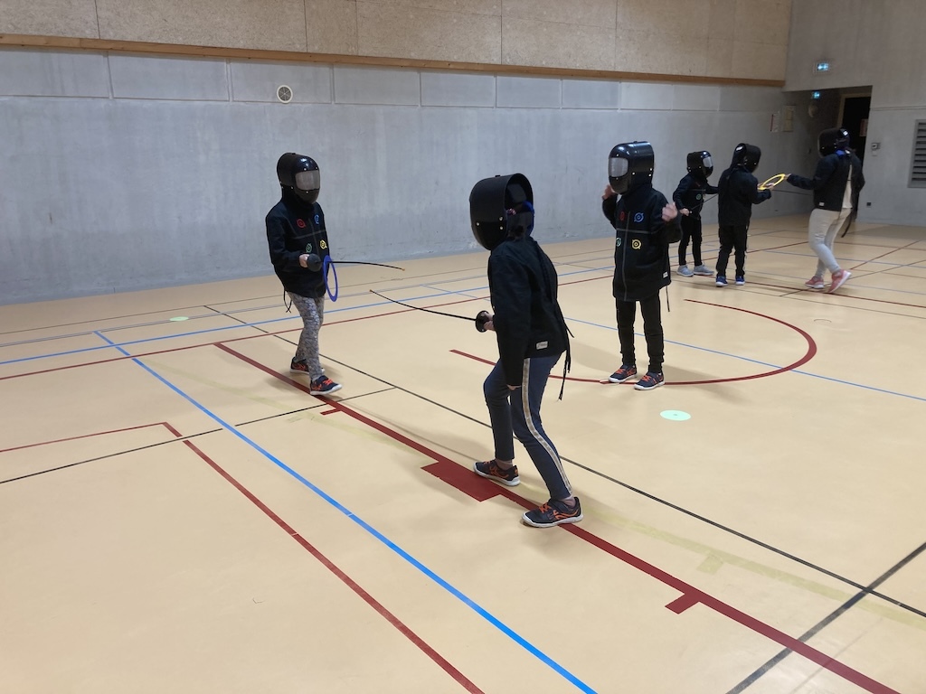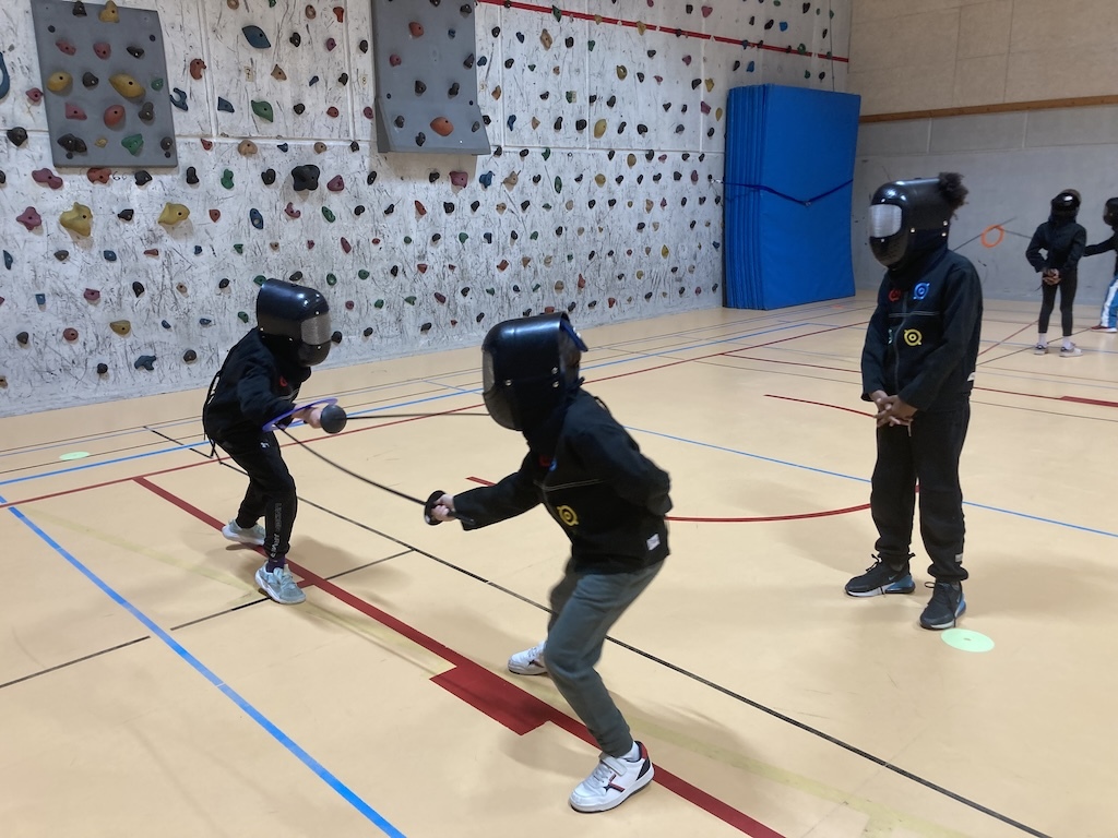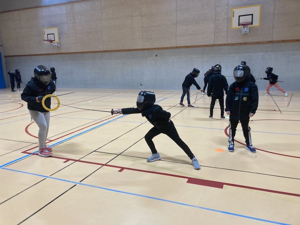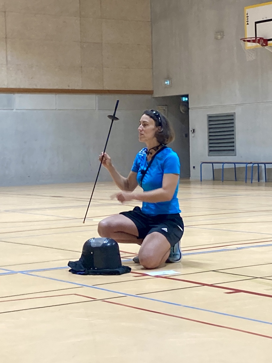 Maintenant, nous savons nous équiper (veste, masque et fleuret), nous déplacer (marche et retraite), attaquer (fente), alors nous précisons nos gestes et apprenons à arbitrer.