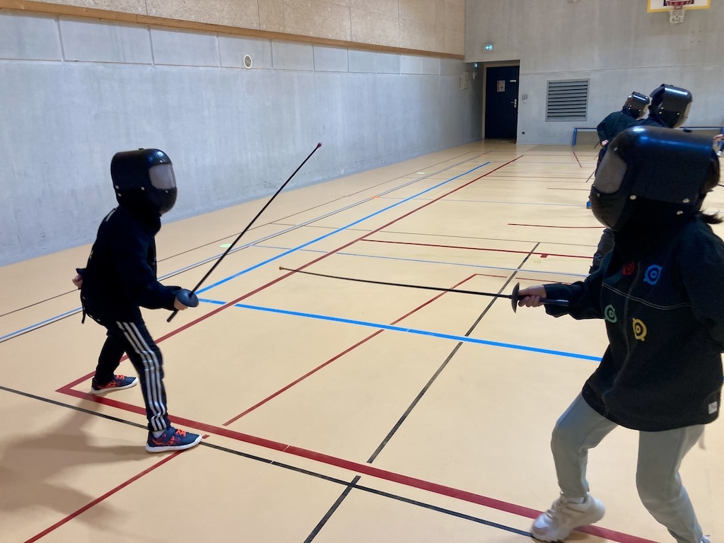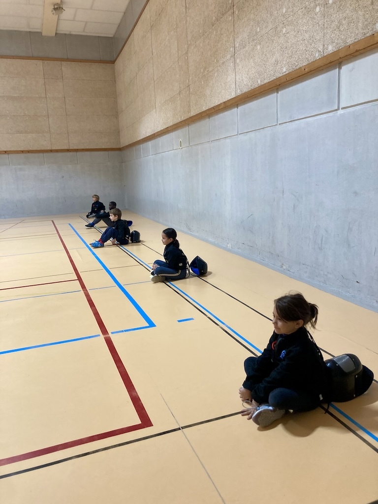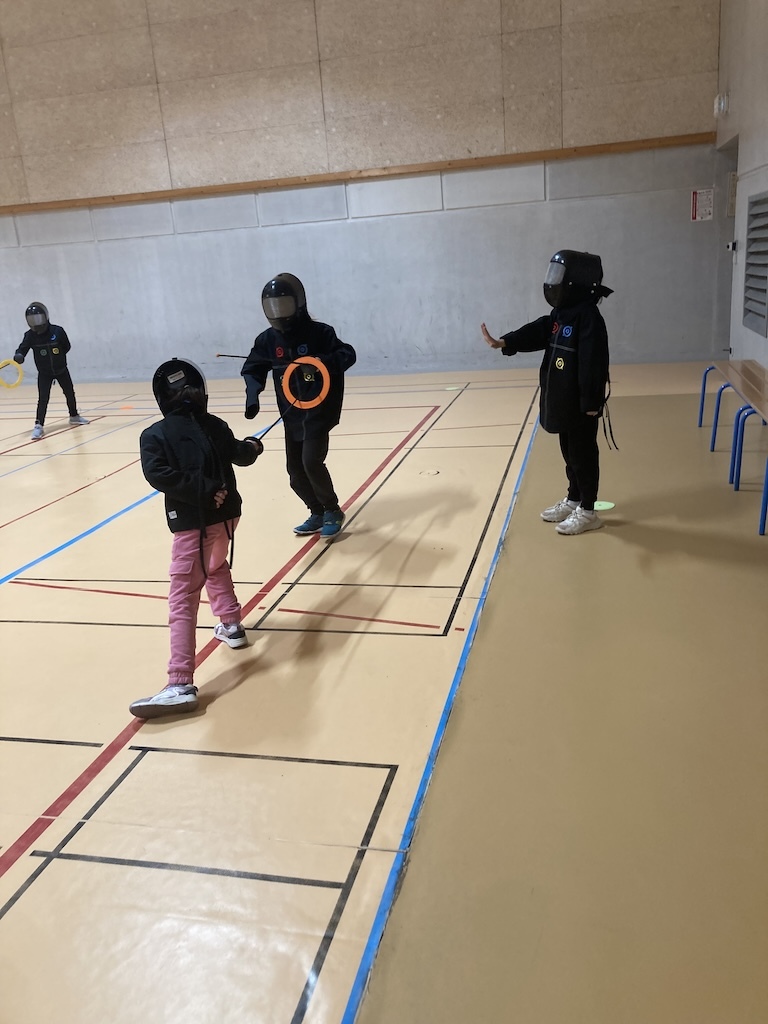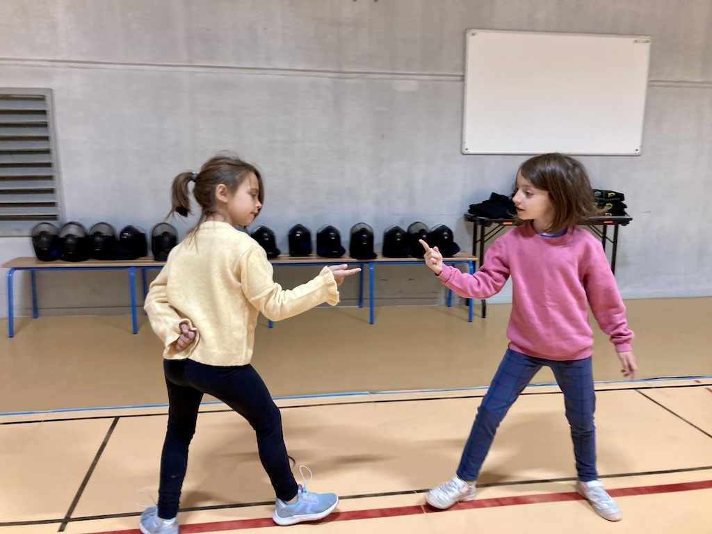 Sur chaque piste, nous endossons tour à tour le rôle d’arbitre : il faut dire fermement les commandements (« à vos fleurets », « saluez », « en garde », « prêts? », « allez », « halte »…) en faisant les bons gestes. Ce n’est pas facile mais certains réussissent déjà très bien !