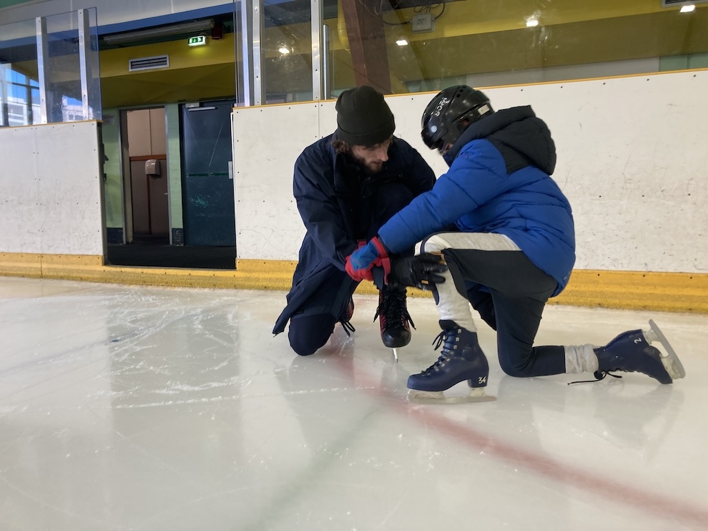 Waisam décrit : « On est arrivé à la patinoire et la maitresse a commencé à appeler les pointures. Après avoir pris les patins, on va sur les gradins. On met les patins, le casque et les